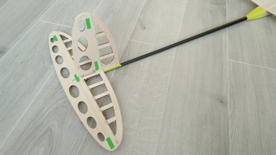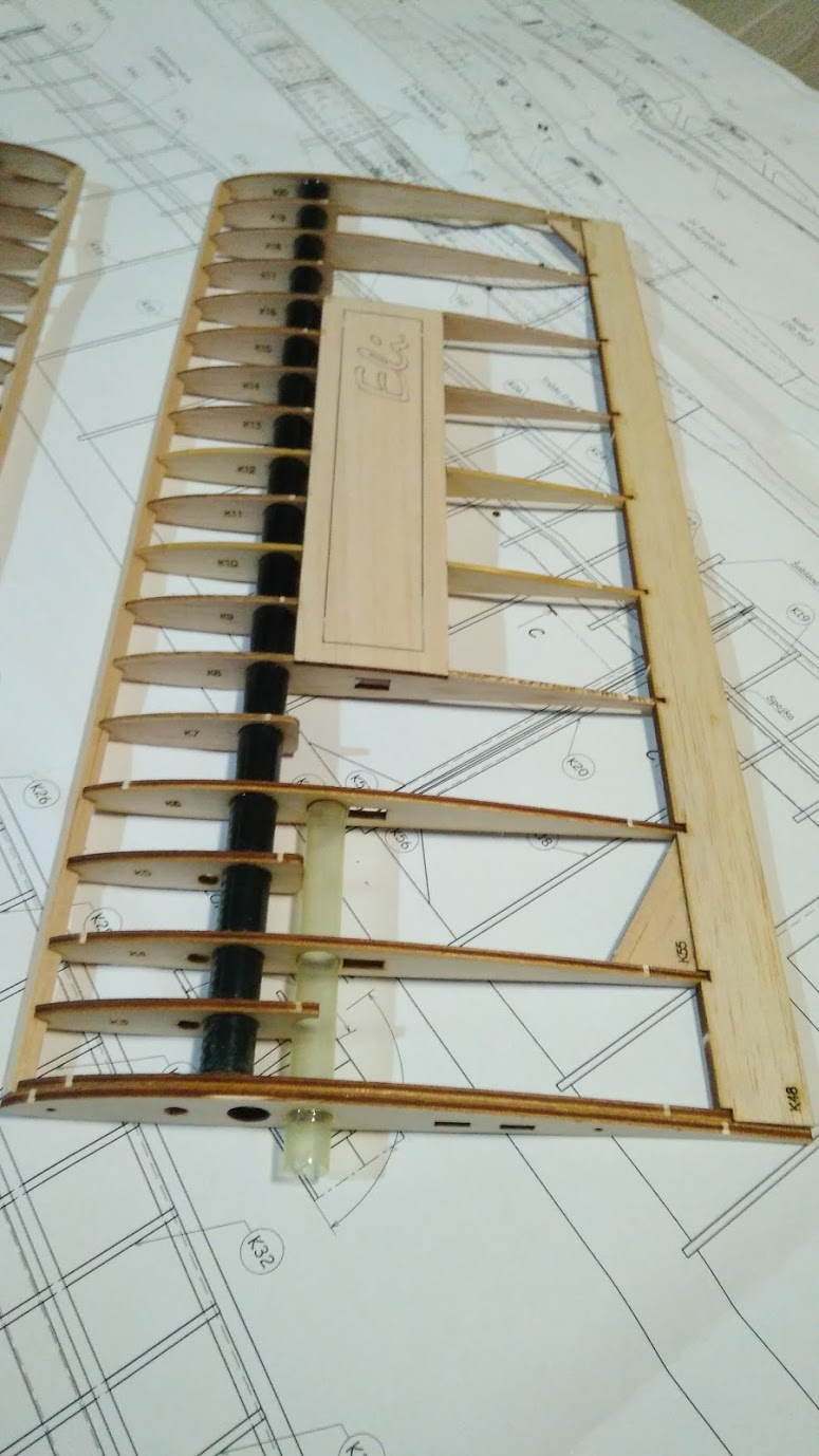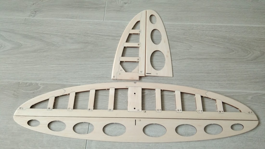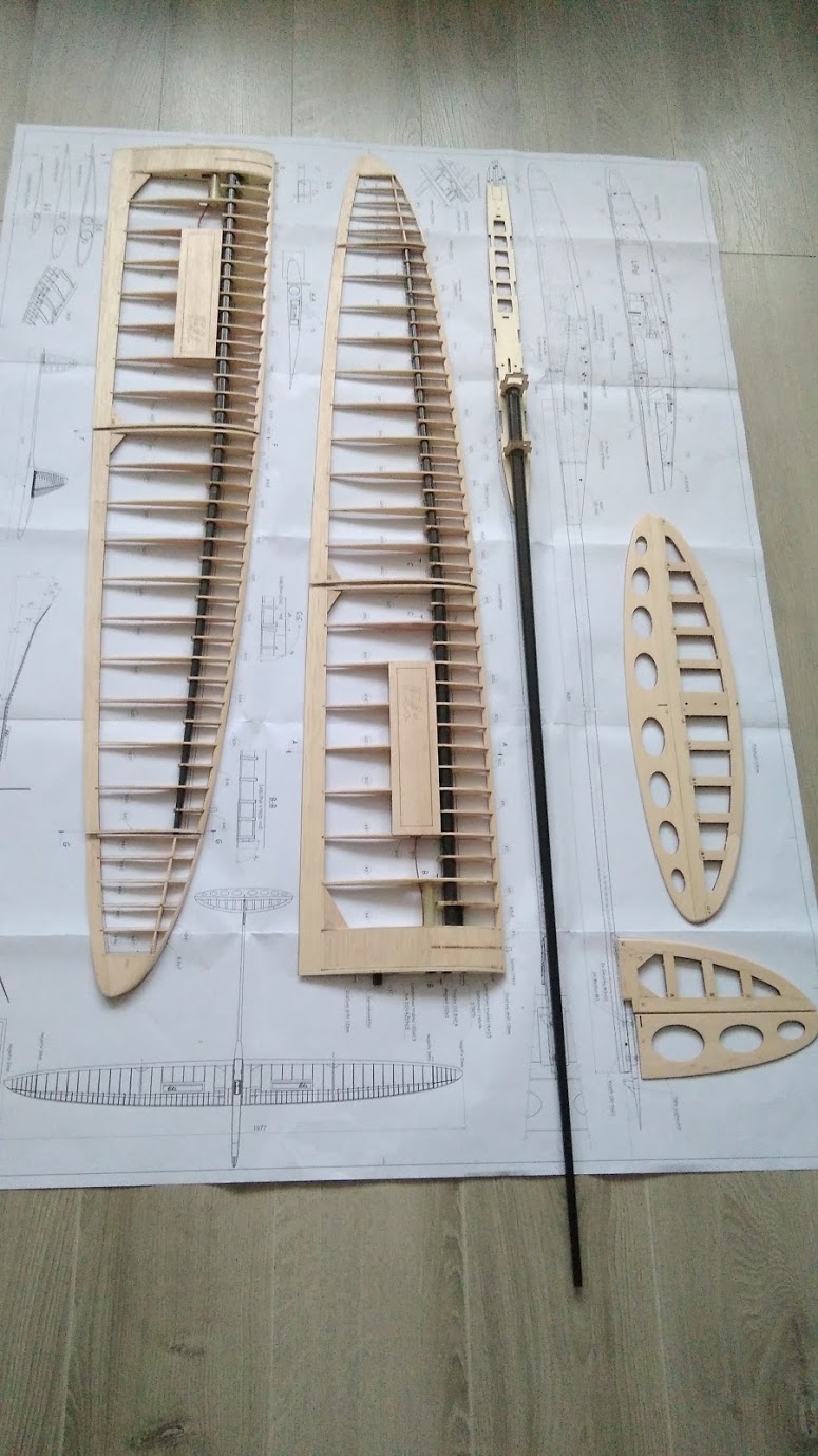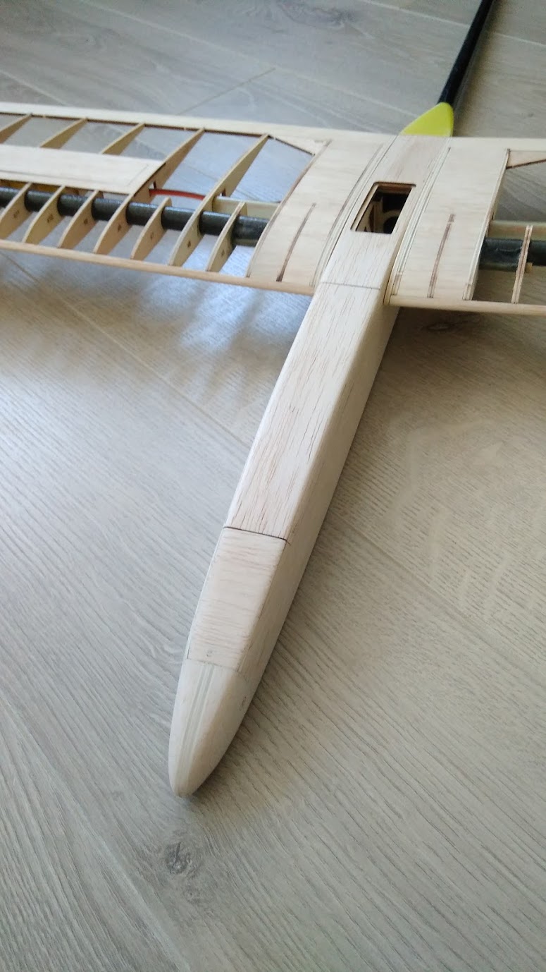Very accurate kit makes building a dream. They look so beautiful, as I hoped. Didn't glue the 6 panels so they can be covered apart.I will use just a few drops glue in between them before flying. That may save unnecessarily damage in unhappy landings. The tail doesn't appeal to the graphics of the wings and will be build in much more transparent and lighter/stiffer. Tailseat in soft balsa will be exchanged . Fuselage is neat and stiff but nose was to be thickened to get a little Axy outrunner innside. Looking forward to fly this beauty in a few weeks.