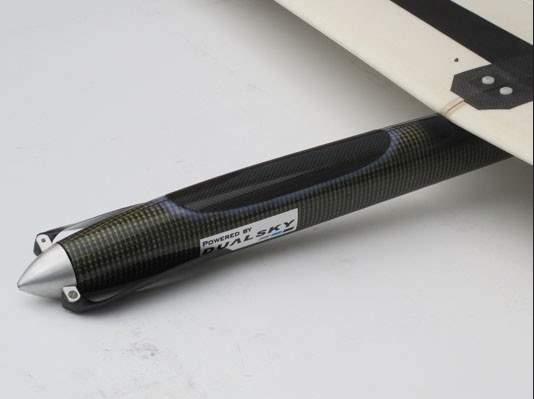 The nicely finished smooth glass skinned foam core wing has a substantial carbon spar. Each wing half is molded with the polyhedral in place, ensuring a very smooth and low drag surface, and good stability. The small lightweight fuselage pod is of kevlar/carbon construction and can accommodate folding props up to 20" diameter, allowing good climb rates. The convenient canopy hatch allows access to the electric motor and battery. The rear fuselage is made of a lightweight but long carbon boom, giving excellent flight stability.