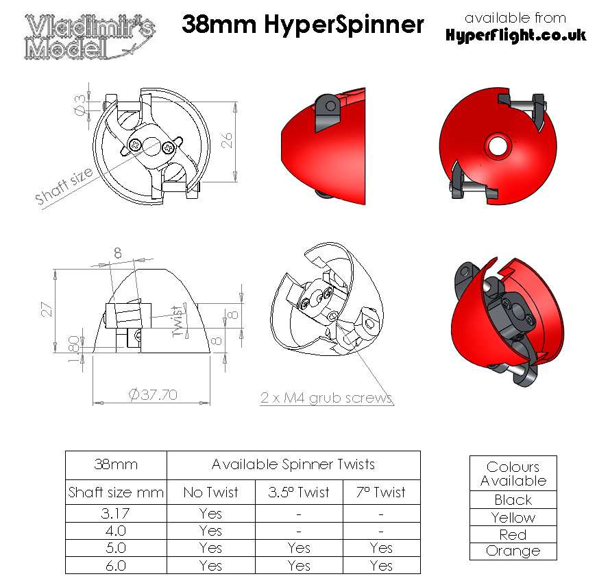 Vladimir's Models HyperSpinner/HyperSpinner Power for 8mm root folding propeller blades, suitable for AVA-Pro, Supra, Sprite, Mini Graphite and all models requiring a 38mm spinner. The machined alloy yoke (centre piece) in this version has a centre boss to provide a better attachment to the motor shaft. Two polished steel hinge pins securely mount the prop blades and unlike other designs do not have stress raisers where the thread ends. Two grub screws are used to securely attach the assembly to the motor shaft.