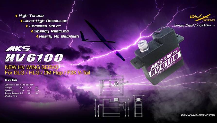 MKS HV6100Even faster than the normal DS6100, very precise, zero slop. My choice for F3X gliders with narrow fuse, on v-tail where absolute precision is needed for minimal throw and trim adjustments!