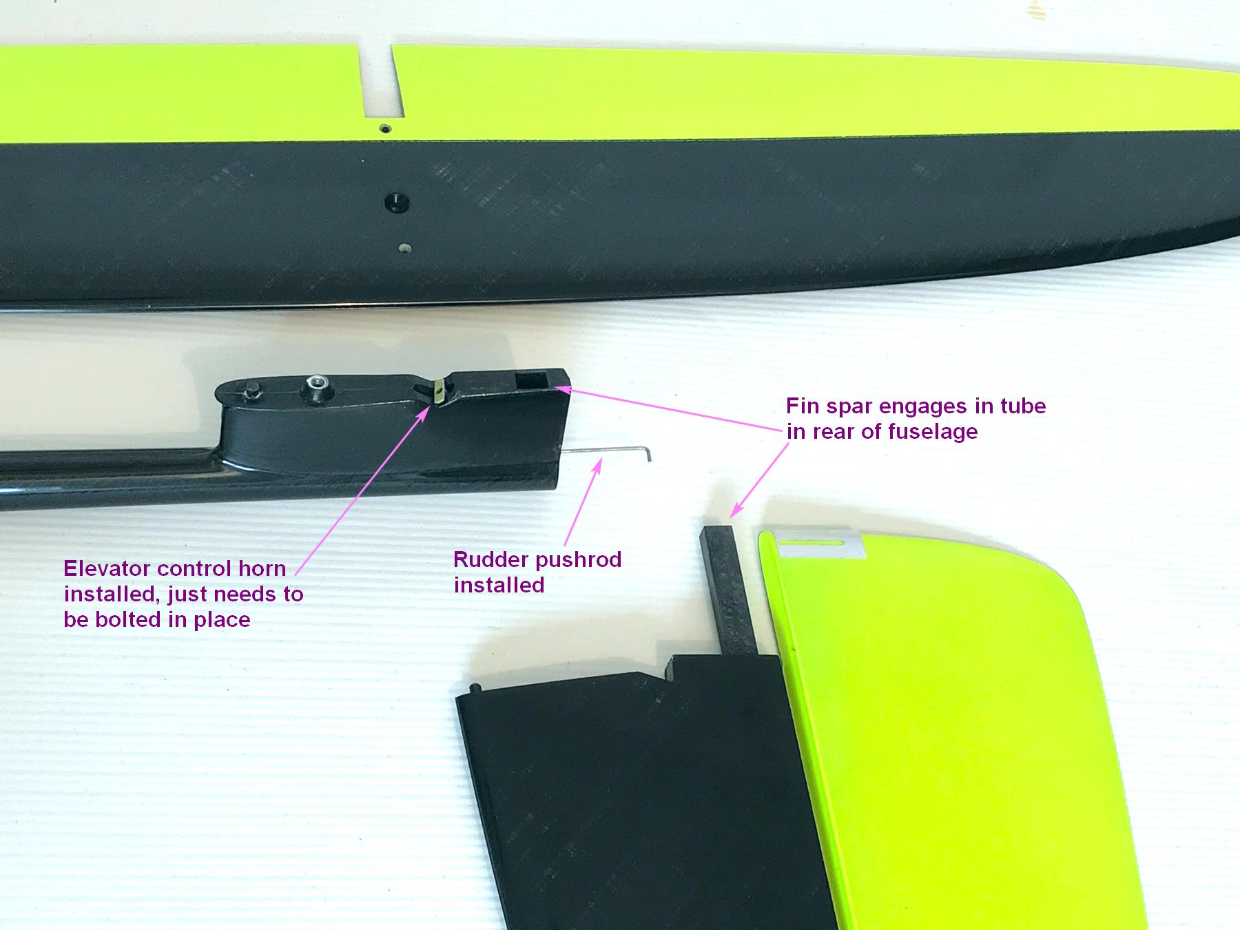 The fin and tailplane are nicely molded from lightweight spread carbon over a Rohacell type foam core, and are both light and reasonably strong. The removable fin has a strong oblong spar at its base that locates in a suitable tube in the fuselage rear. The fin is retained in flight with small lengths of clear tape over the join.