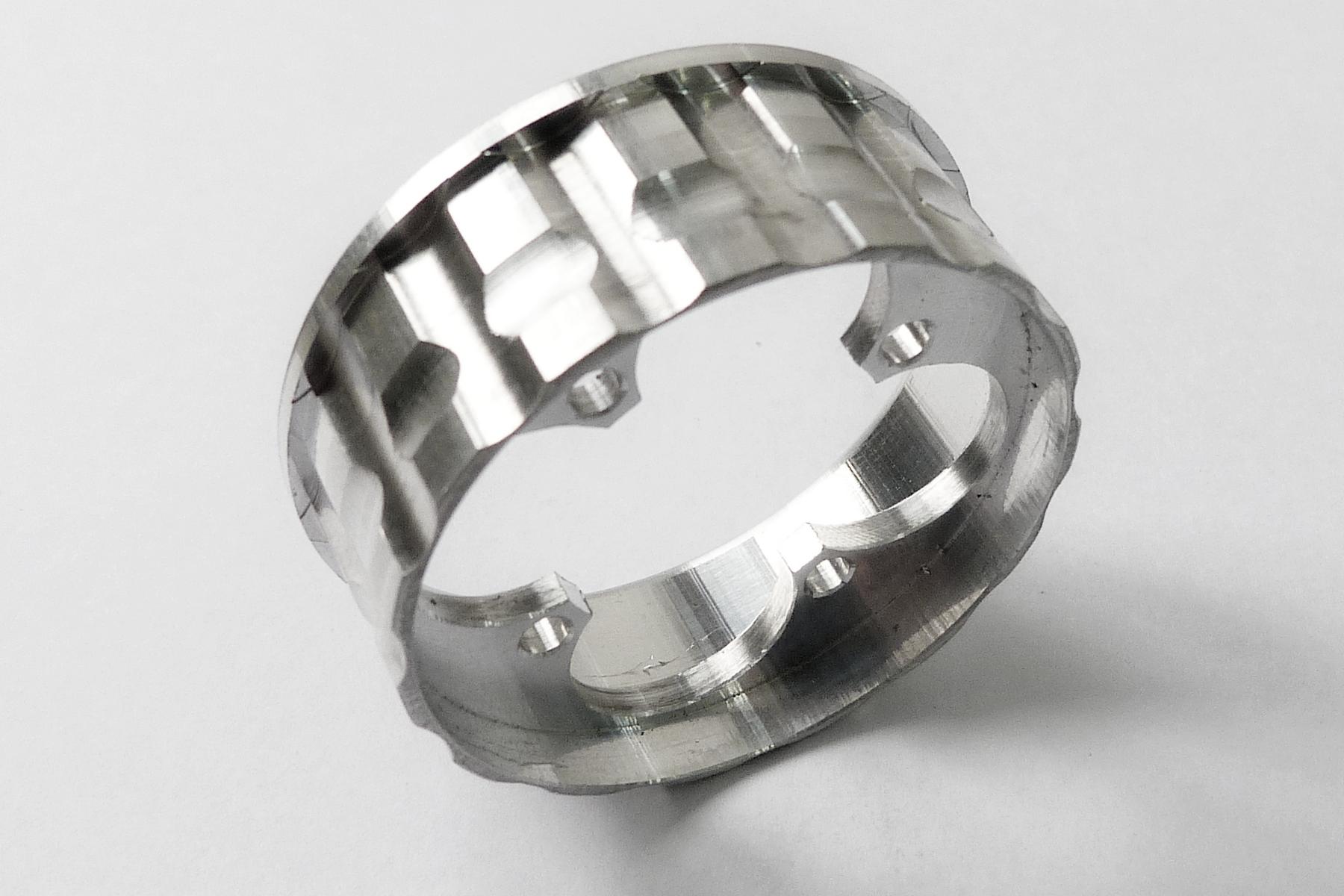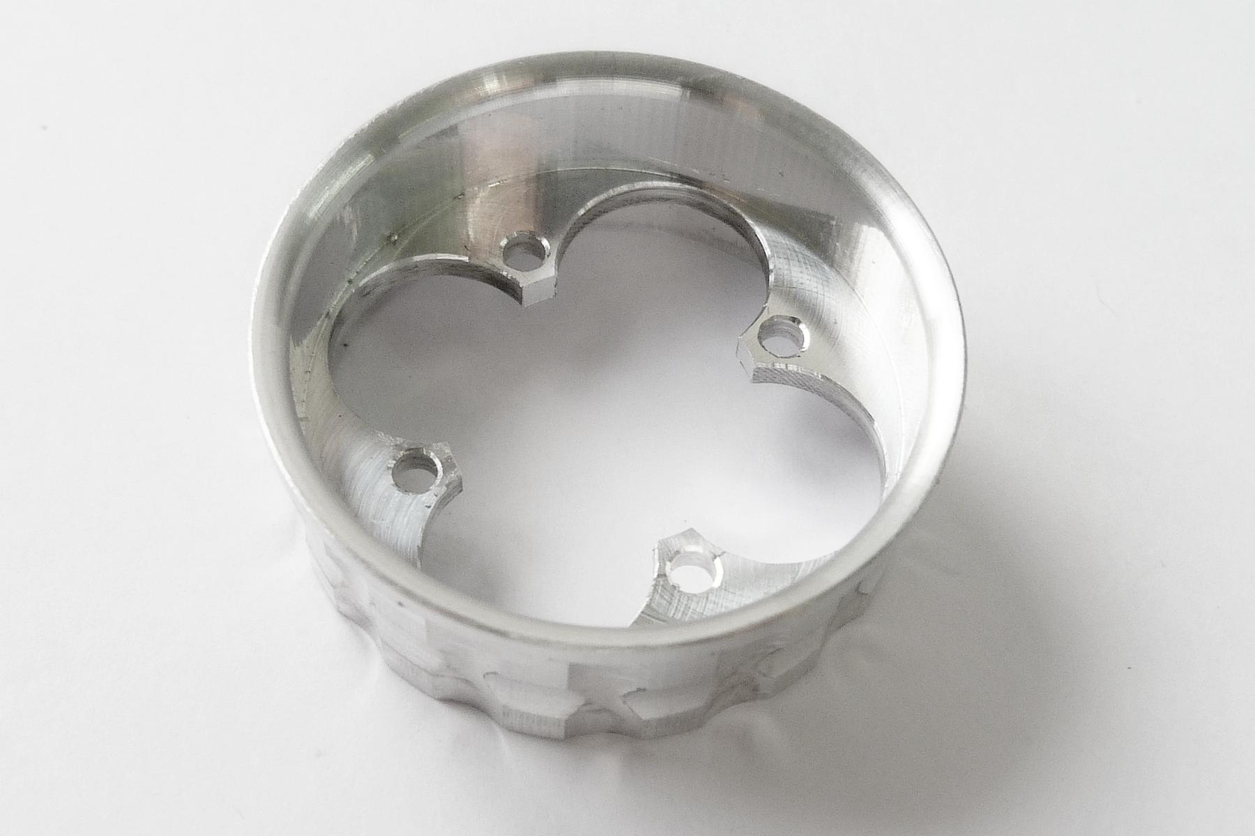 Instead, I chose a geardown motor and this CNC milled aluminum mount. It fits with the nose by cylindrical plain, giving substantial stability. Wide opening and the material itself may help cooling of the gearbox and the motor. Circular notch at the front end enables precise alignment, like placing a cap on a bottle.