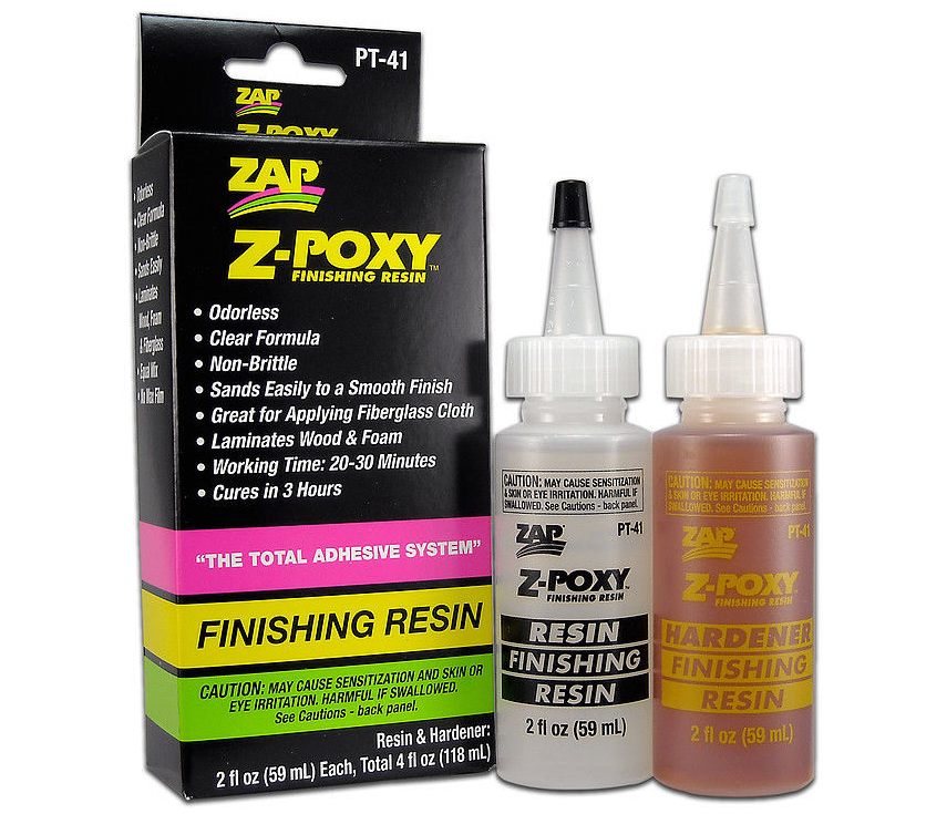 Z-Poxy PT41 Finishing Resin is a premium light weight two part laminating epoxy/finishing type epoxy resin. Use for wetting out carbon fibre, glass fabric, or Kevlar composites. Suitable for reinforcing the centre section of a wing or the entire model. Great for sealing model boat hulls, inside and out. Use to seal all engine and fuel tank areas. It is absolutely the best for sheeting foam wing panels. It will bond to itself and does not get brittle with age. Long cure formula for easy application, sands easily for a smooth finish and is compatible with many paints.