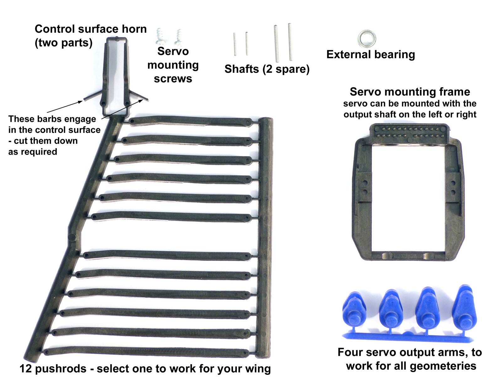The connection between the servo and control surface is made via a ready-made hard plastic pushrod, so no cutting or gluing is required, making for a quicker and more repeatable installation. 12 of these mono pushrods are supplied in each kit, varying in length between 48 mm and 81 mm, each approx 3 mm longer than the next. These new IDS sets are labelled "Mono" as the pushrod is a monolithic component, not an assembly of parts that can come apart.