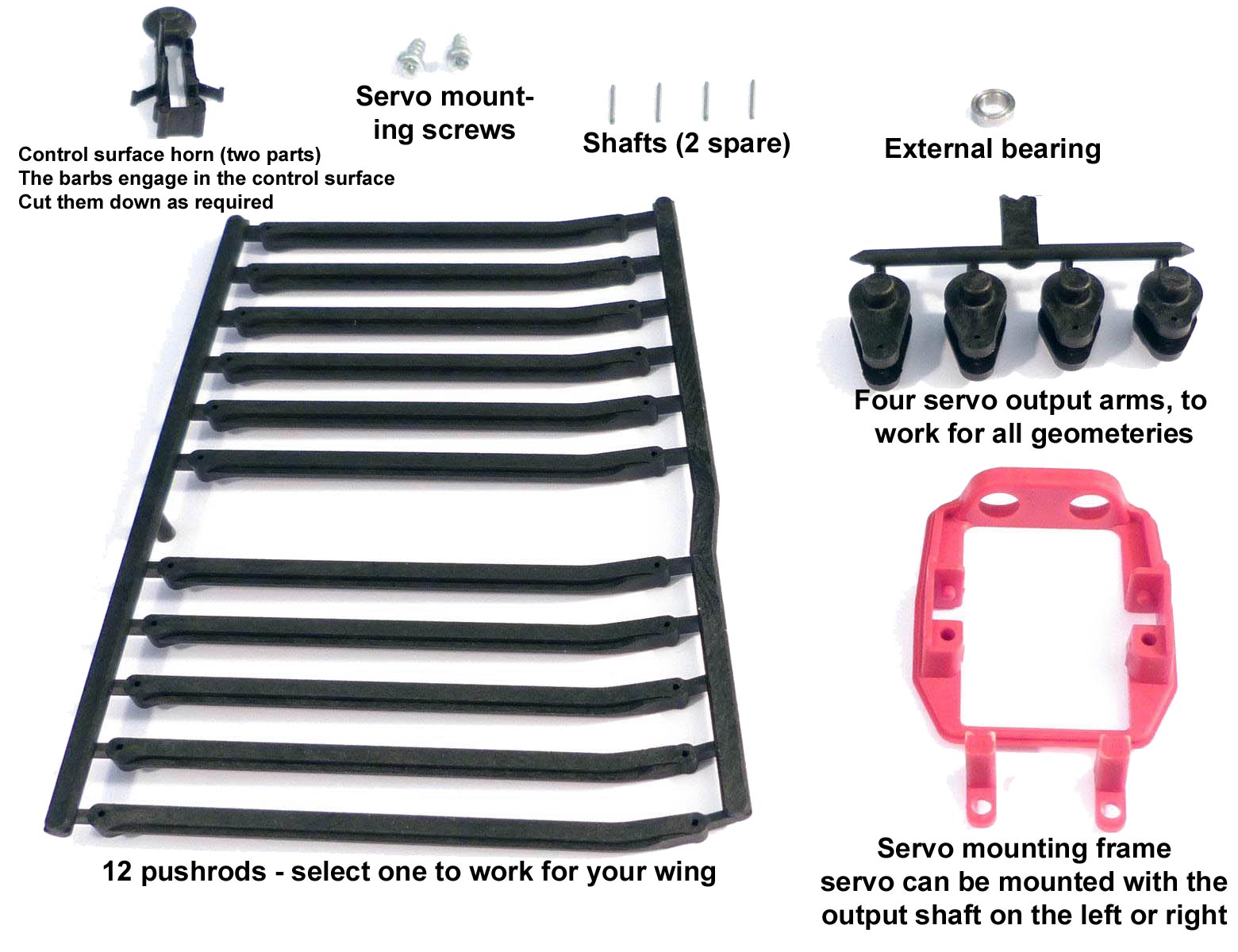 The connection between the servo and control surface is made via a ready-made hard plastic pushrod, so no cutting or gluing is required, making for a quicker and more repeatable installation. 11 of these mono pushrods are supplied in each kit, varying in length between 62 mm and 80 mm, each approx 1.8 mm longer than the next. These new IDS sets are labelled "Mono" as the pushrod is a monolithic component, not an assembly of parts that can come apart.
