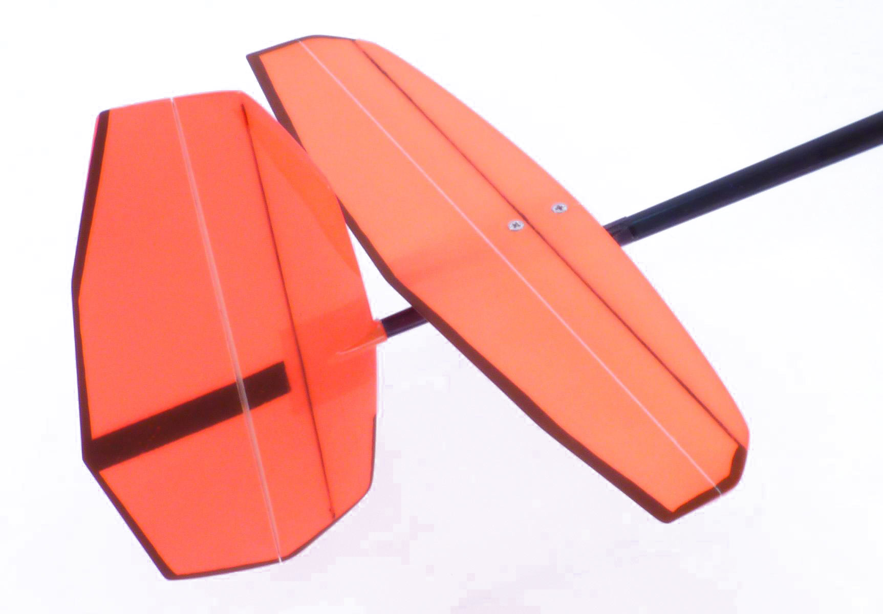 The flying surfaces are all solid core molded, with workmanship of the highest standard. The fin is glass over foam, with carbon reinforcements. The fin incorporates a tubular front part, to mate with the fuselage tailboom, for easy and accurate construction. The tailplane (horizontal stabiliser) is of similar construction to the fin, and is mounted on a short pylon above the tailboom. The wing especially is wonderfully made, with a high gloss finish and attractive very visible colour schemes. The supplied accessories include a throwing blade, all control horns, and pushrods.