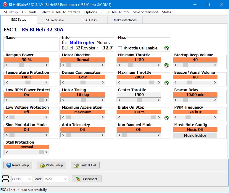 The all-in-one powerset is well engineered and a brilliant help in getting a small ELG into the air in minimum time. The ESC comes with Blheli software loaded so is easily and fully programmable via a laptop or smart phone.