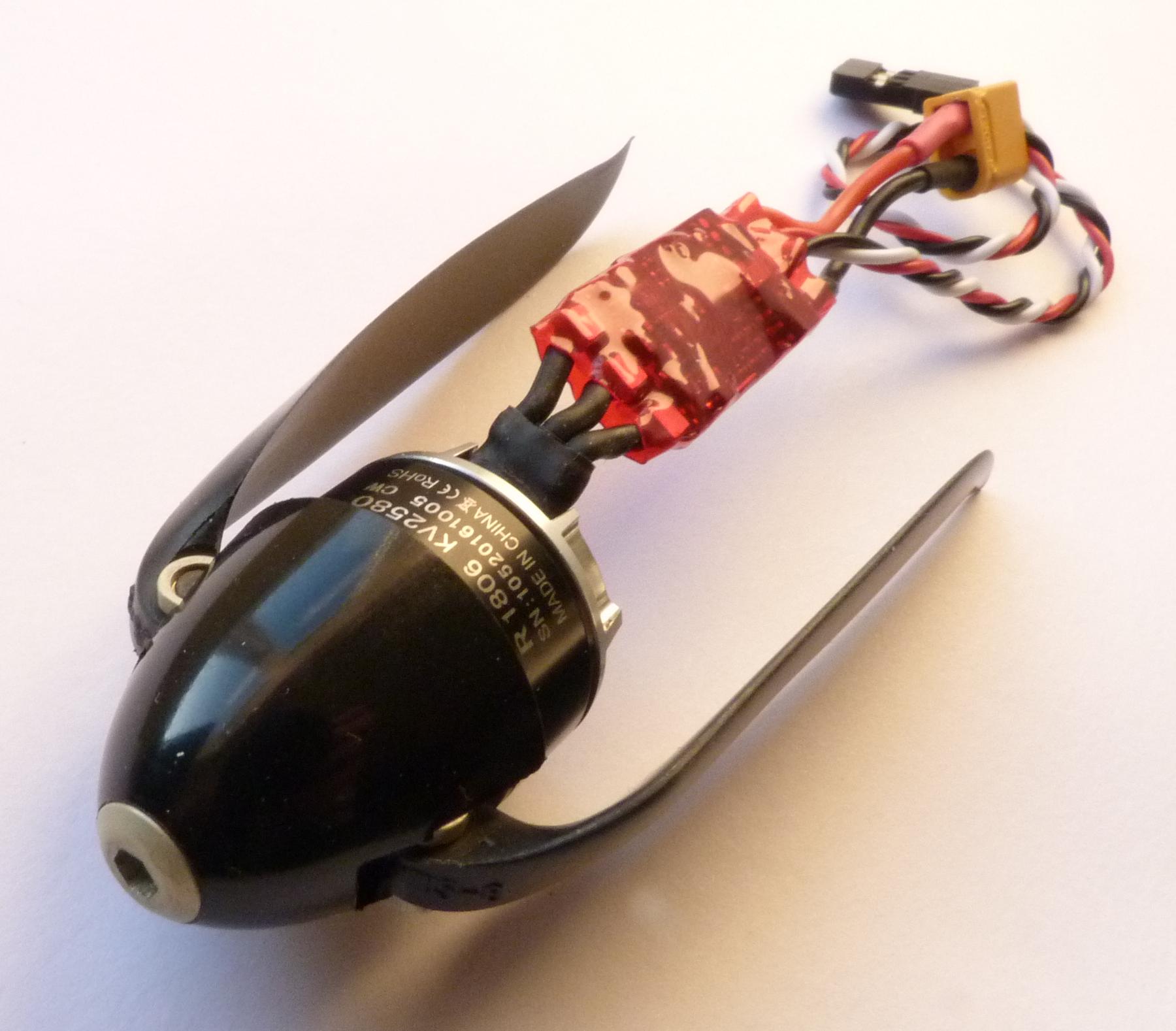 The VM F5K/Snipe 2e power set consists of a pair of VM 6x4 carbon folding prop blades in a VM 25 mm spinner ready mounted onto a LDARC XT1806 2500 RPM/V racing outrunner. To this a KS 30A speed control running BLHeli32 firmware has been expertly soldered. The battery plug on the ESC is an XT30 but this can be replaced if necessary