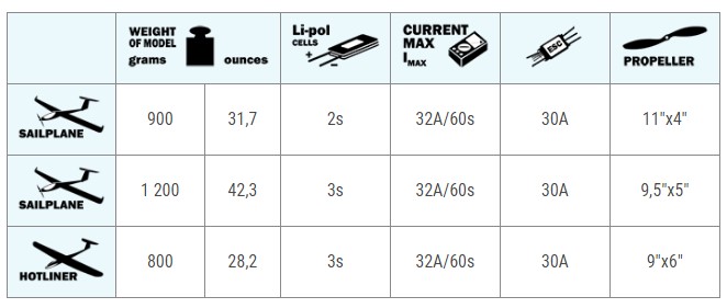 Good motor for F5J or fun flying up to 2kg sailplane. Needs 32mm nose or widening up fast as motor wires comes out in front of motor. been using it in Pike Prestige 32mm nose for over a year. can be used with 4S up to 40A if you limit motor time to 30sec. Some test results here: http://www.jojoen.no/div/2020testingmotor.pdf