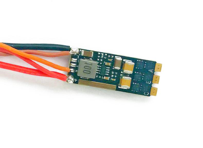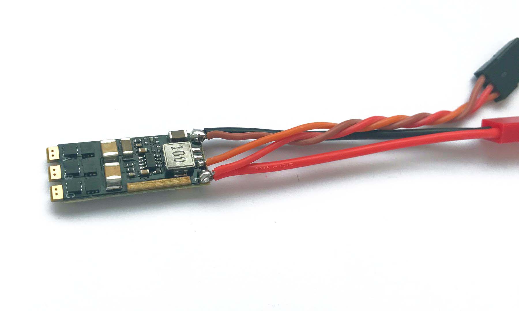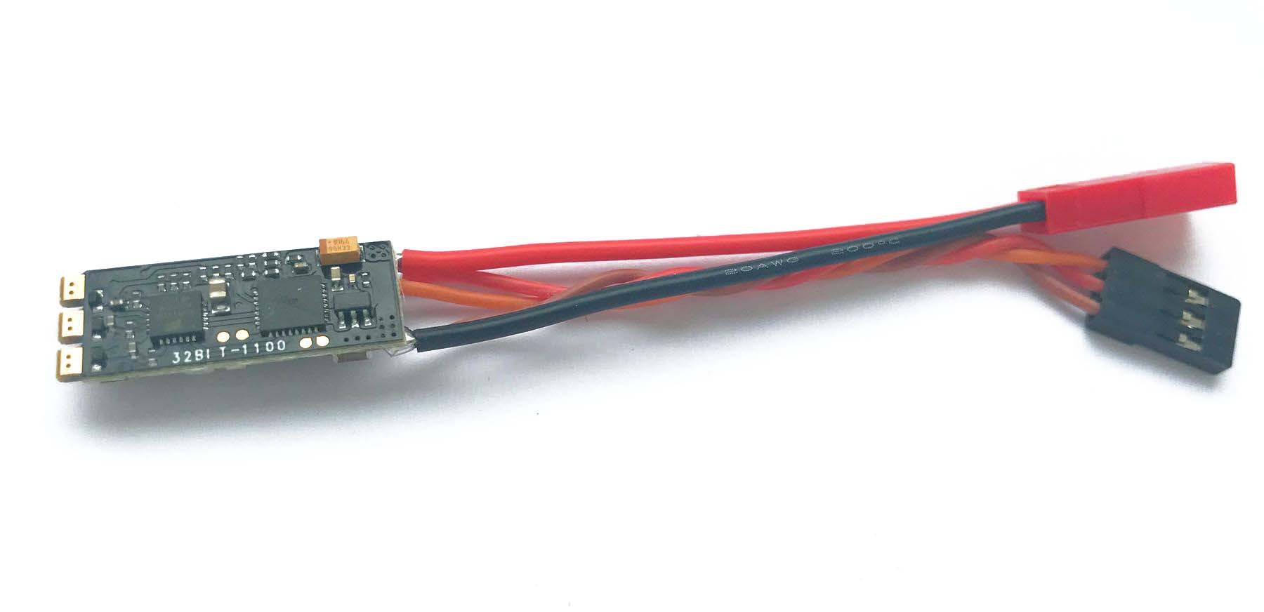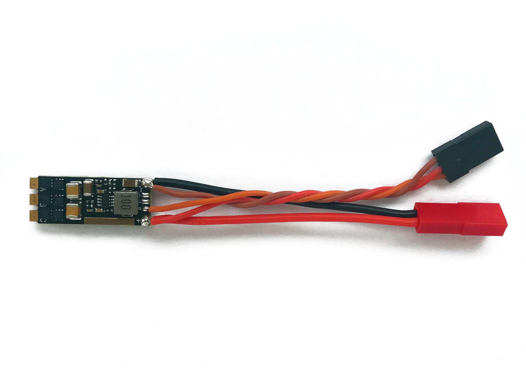 Ready fitted with 7 cm battery lead with red Mini JST (BEC) socket and 7 cm JR RC lead. There is no battery eliminator circuit so the RC positive is the same voltage as the battery - do not use low voltage (5V) servos with this ESC.
