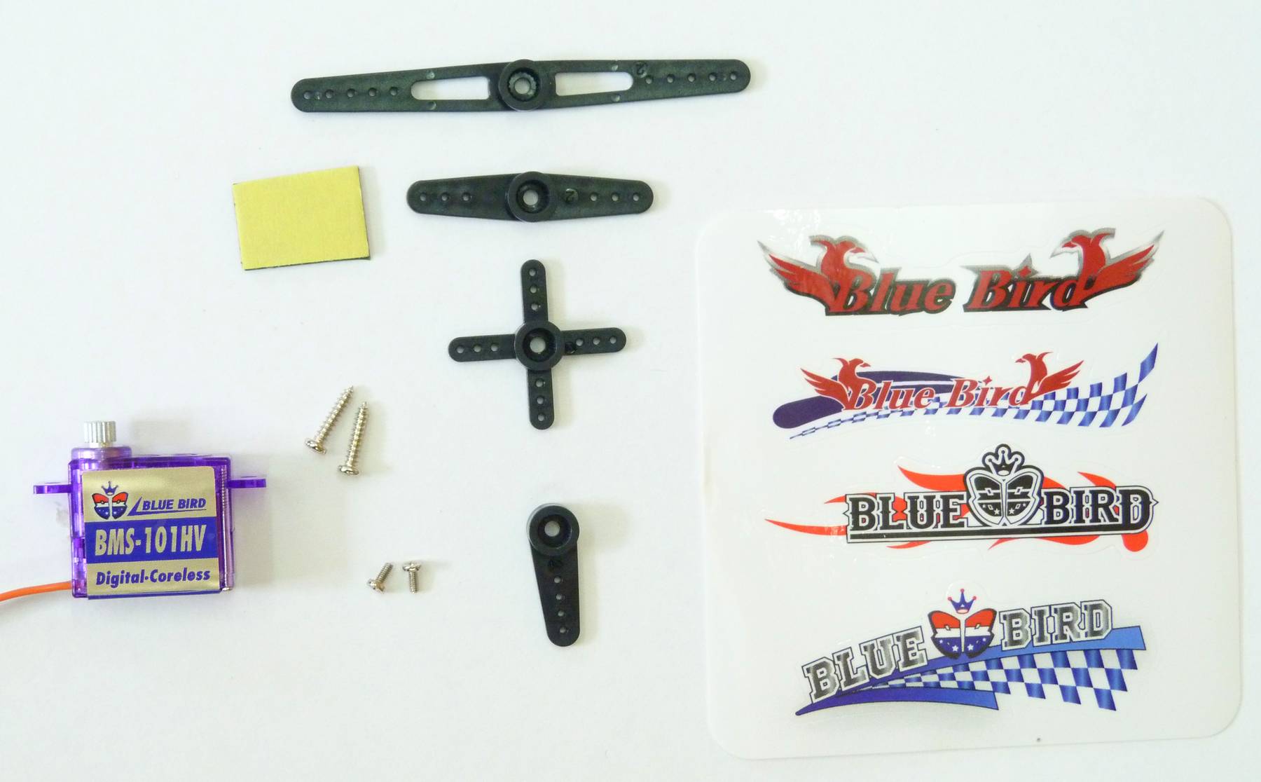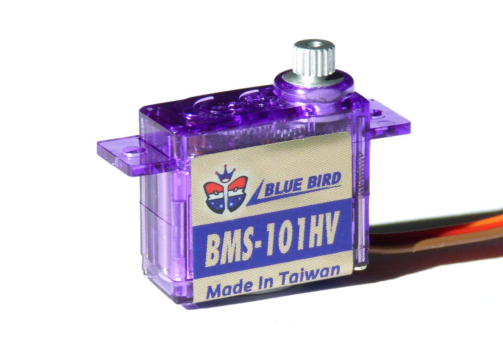 The Blue Bird BMS-101HV is a tiny metal gear high voltage servo from Blue Bird. This great servo is strong, powerful and has a very tight geartrain with little or no free play. Featuring low weight, a 7.6 mm thin case and over one kg-cm or torque this is an excellent servo for DLG / HLG / F3K / F3P / 3D EP RC models where the RC is run directly from a 2S LiPo battery.