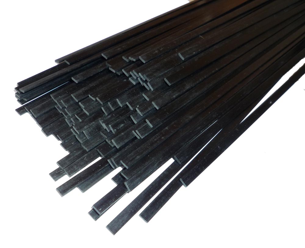 1.0 mm x 4.0 mm rectangular high modulus carbon fiber strip available in various lengths. These pultruded carbon fiber composite strips have a high fibre content of high modulus carbon in an epoxy matrix, making them extremely rigid and strong.