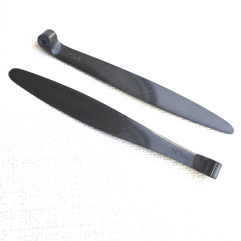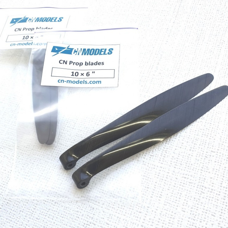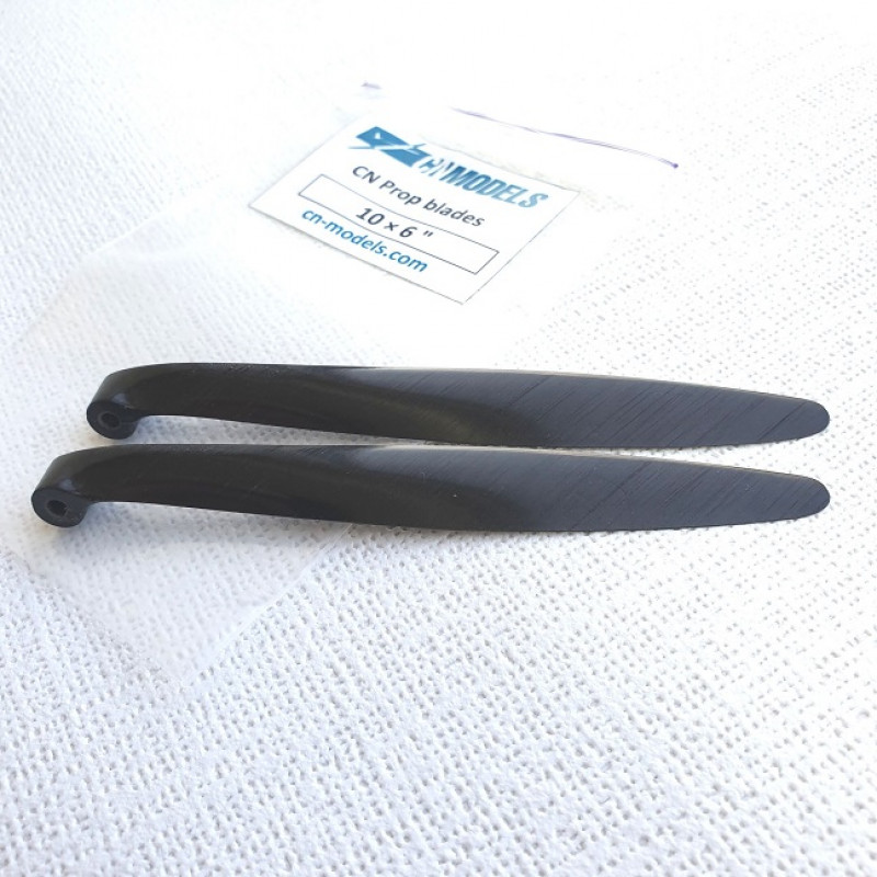 A pair of CN Models 10x6 prop blades suitable F5J electric gliders. These blades have a flatter high aspect ratio shape and should fold closer to the fuselage, reducing glide drag.
