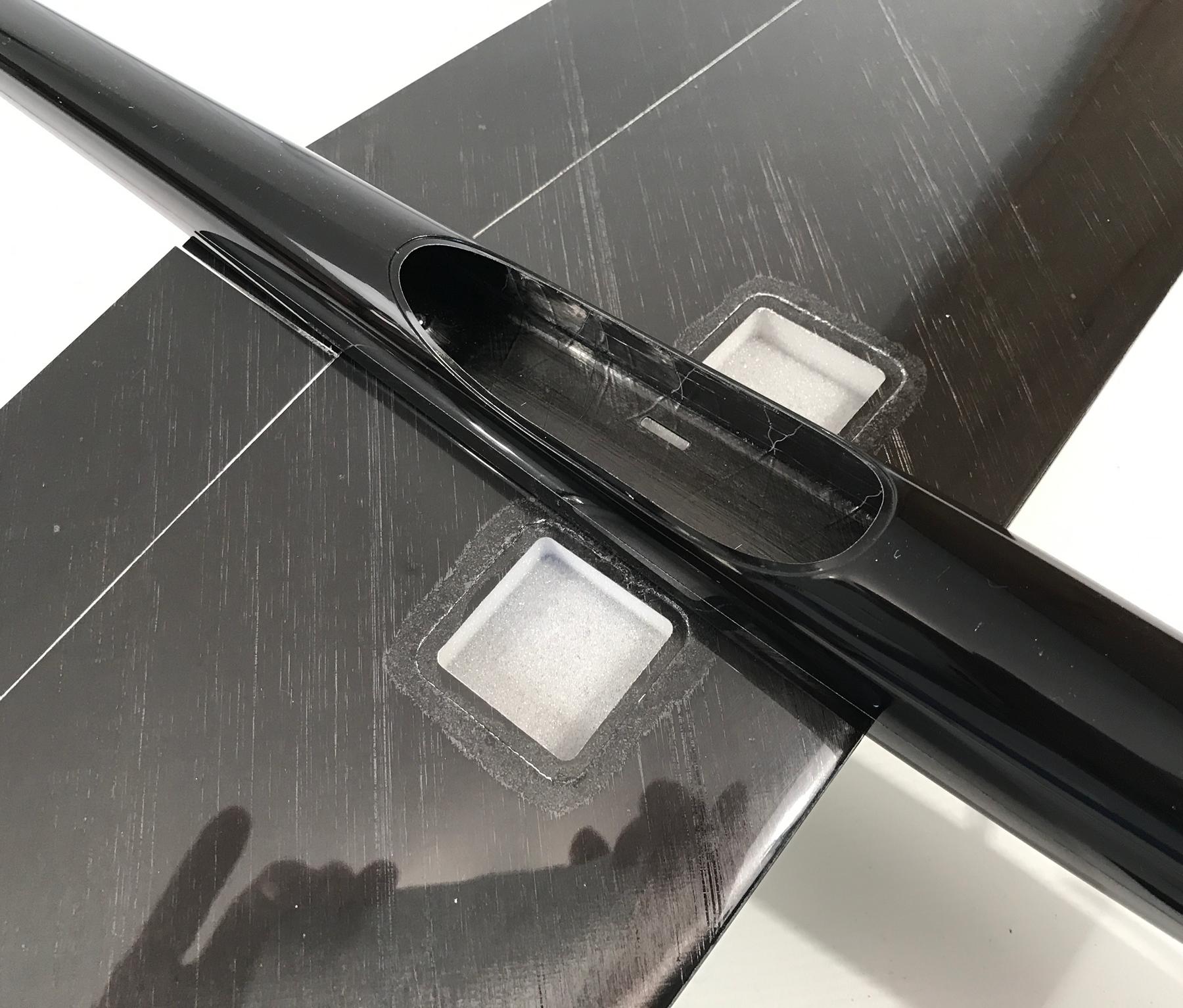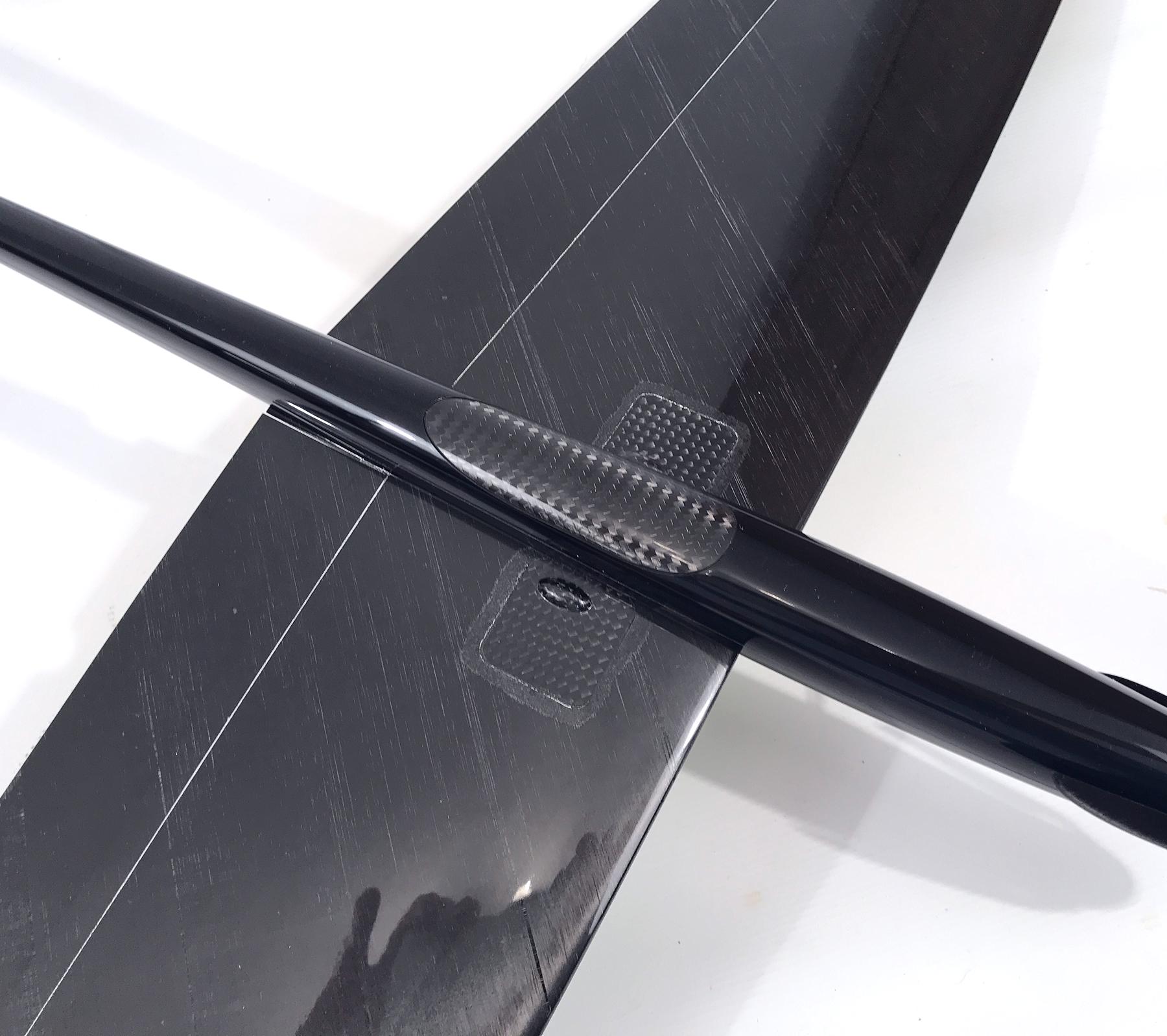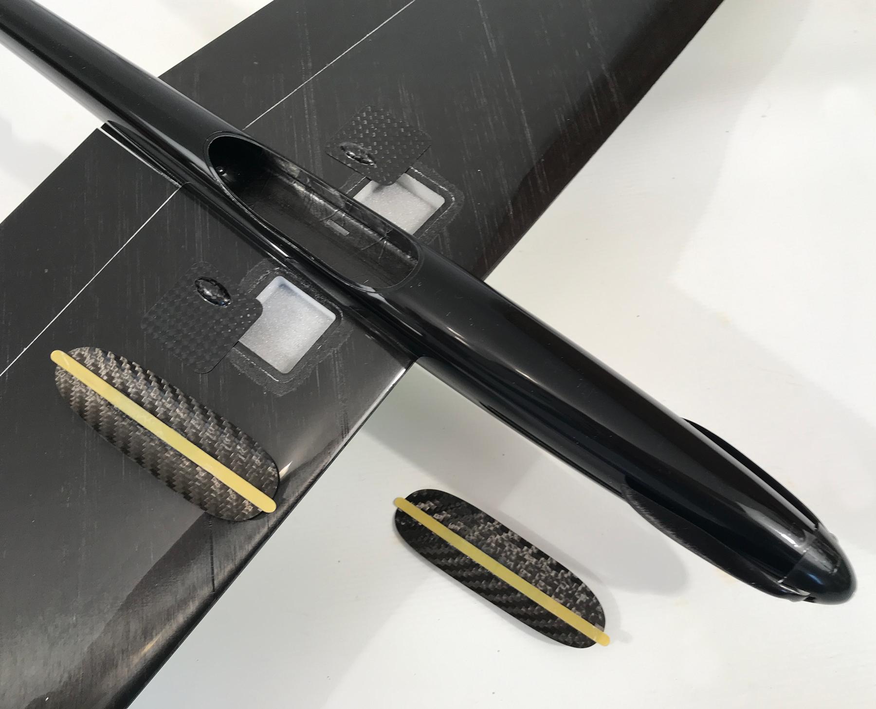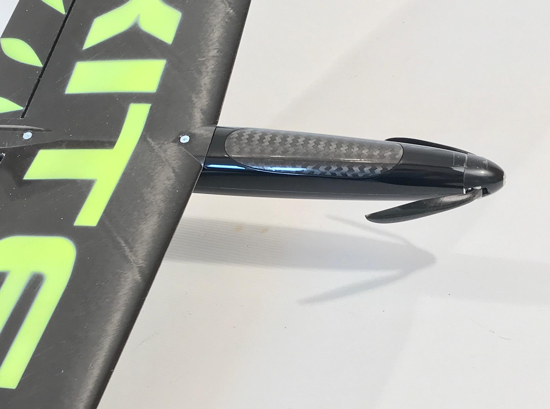 The spread carbon over Rohacell wing is very nicely made, with a high gloss finish and attractive colour schemes. A very good detail is that the aileron servos are mounted in the wing, giving extra space in the fuselage and simplifying the aileron linkage. Low drag servo covers perfectly cover the servo openings.