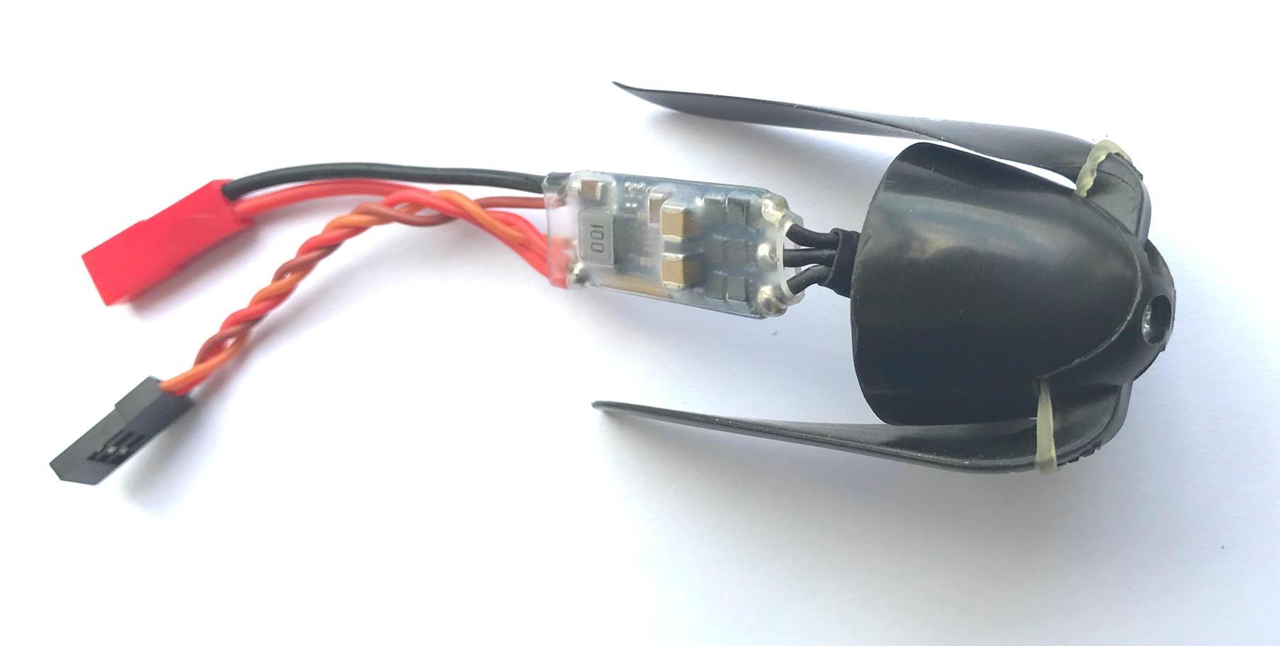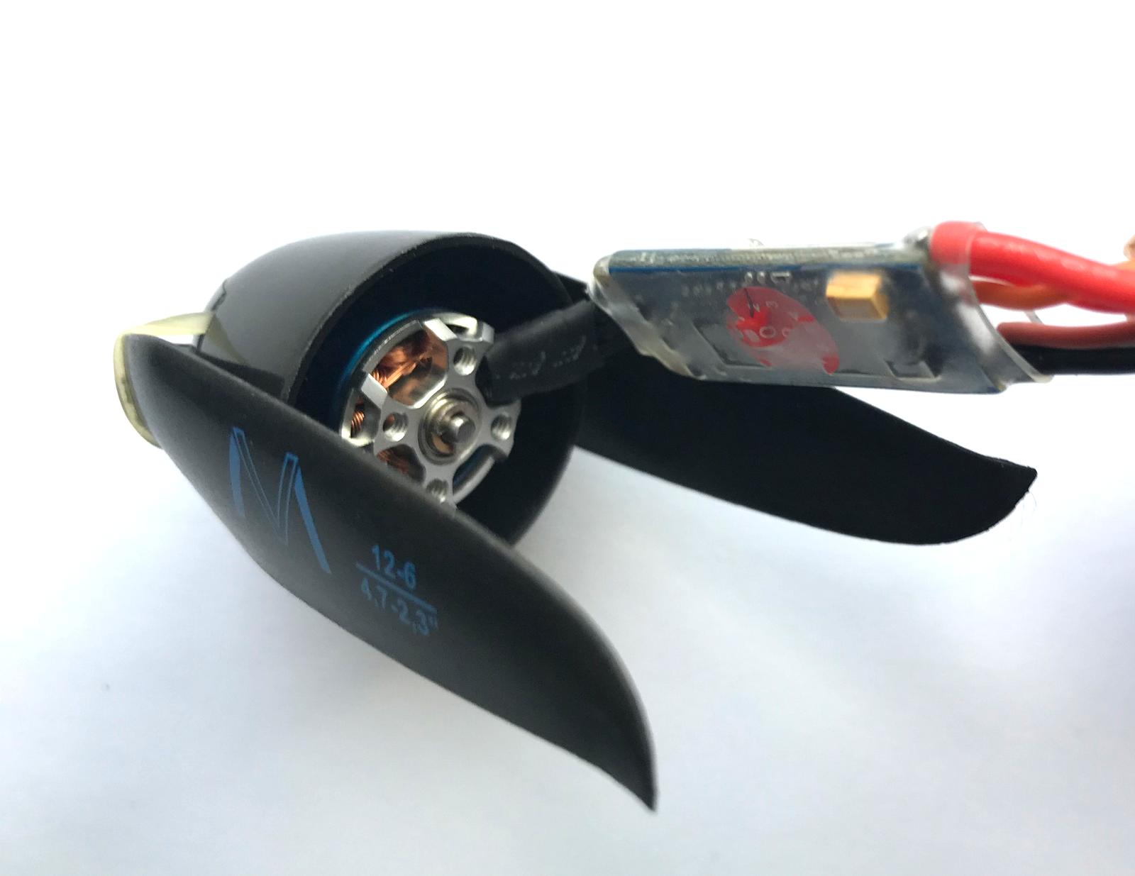 The VM Elf Pro El and Spin ultralight power set consists of a pair of 4.2x2.3 VM folding prop blades in a special 25 mm spinner ready mounted onto a tiny SunnySky 110X outrunner motor that fits inside the spinner. To this a speed control running BLHeli32 firmware has been expertly soldered. The battery connector on the ESC is a Mini JST red BEC socket but this can be replaced if necessary.