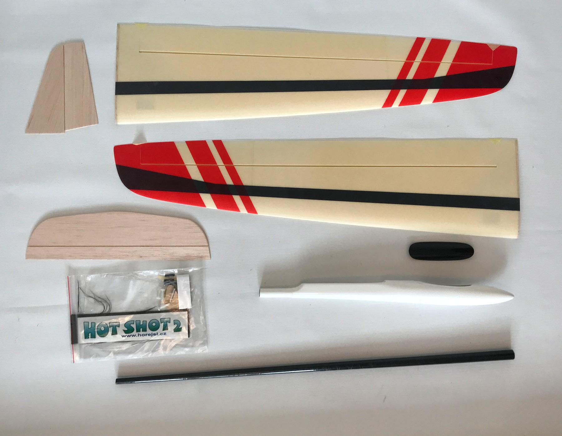 The Hotshot 2 is based on the Longshot DLG with excellent aerodynamics and a nice molded glass / foam / glass wing, with lots of carbon in the right places. The Hotshot’s fuselage is a glass molding with a lightweight rolled carbon tailboom. The R/C is accessed though a handy canopy hatch, and the wings are bolted onto the low pod, keeping the frontal area to a minimum. The pod is supplied with the nosecone in place, and a 32mm firewall is supplied. However a smaller recessed firewall could alternatively be fitted allowing one of our modern lightweight 25mm F5K powertrains to be used. Thus the modeller has total flexibility about motor choices. The tail and fin are lightweight balsa surfaces that will need a little shaping and covering in film. The tailplane is conveniently removable for easy transportation. It is mounted on a prefabricated pylon that is glued to the boom. The Hotshot’s very smooth low drag wing is supplied in two pieces and is easily joined using the supplied carbon reinforcements, and is painted with flashes of colour on the tips. All the linkages are provided, only glue, powertrain and the RC gear needs to be supplied by the builder.