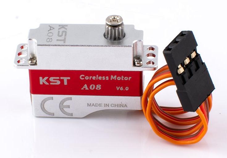 KST A08 V6 is a great low/medium/high voltage fully metal cased servo weighing only 8g (0.3 oz). Unlike the X08 the A08 incorporates a complete case that covers the motor, making the servos much tougher and less susceptible to water ingress, handling and crash damage. Despite this the A08 servo is actually lighter and has more torque than the X08. The A08 is also slightly smaller than the X08, making it suitable for very tight installations.