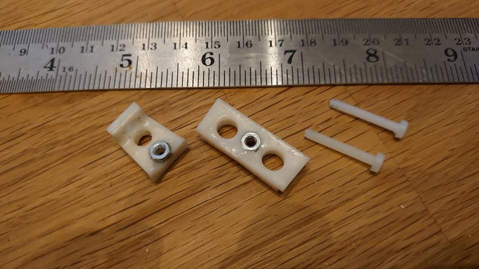 • Resin Printed Horizontal Stab mount, pushrod guides, canopy retainer and Wing hold down brackets. The wing hold downs encapsulate a 3mm steel nut and completely eliminate the requirement to manually drill, tap and harden the threads in the previously used plwood plates.