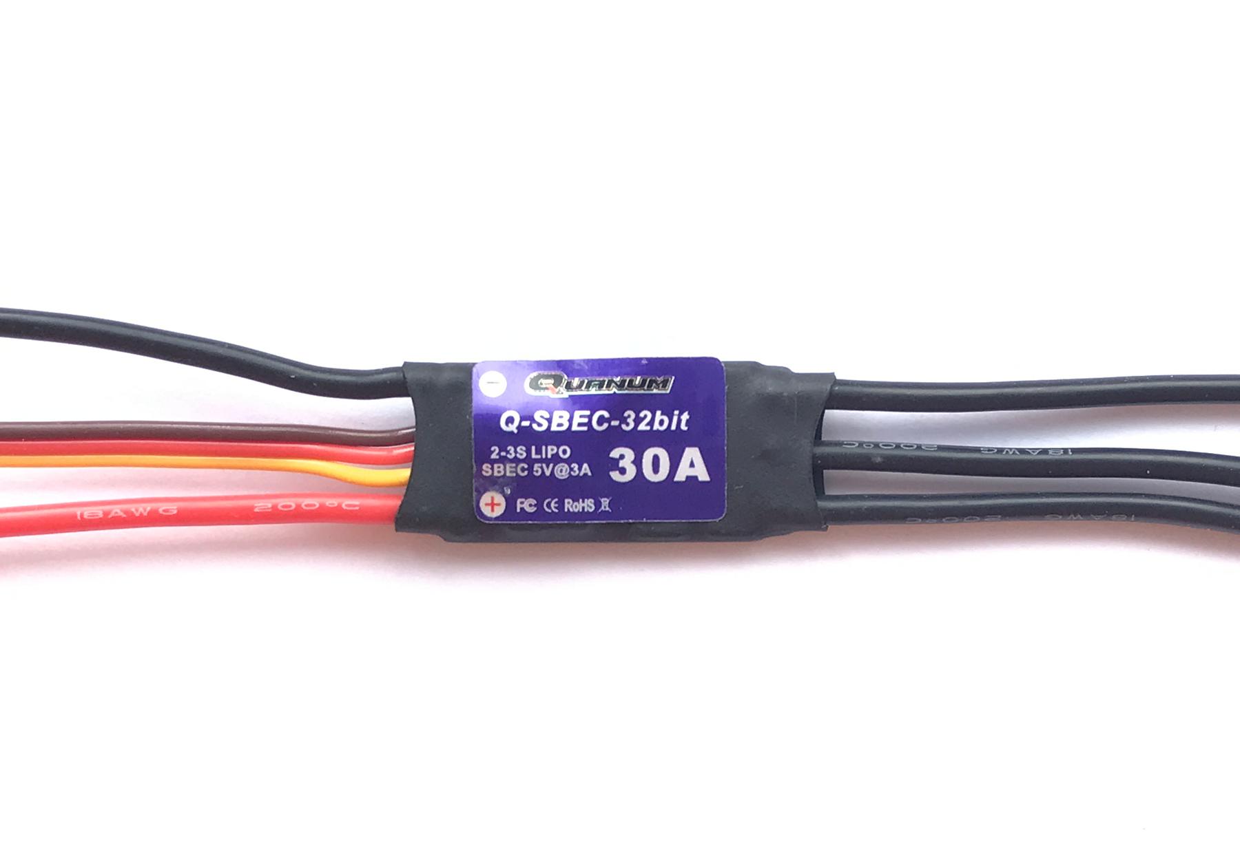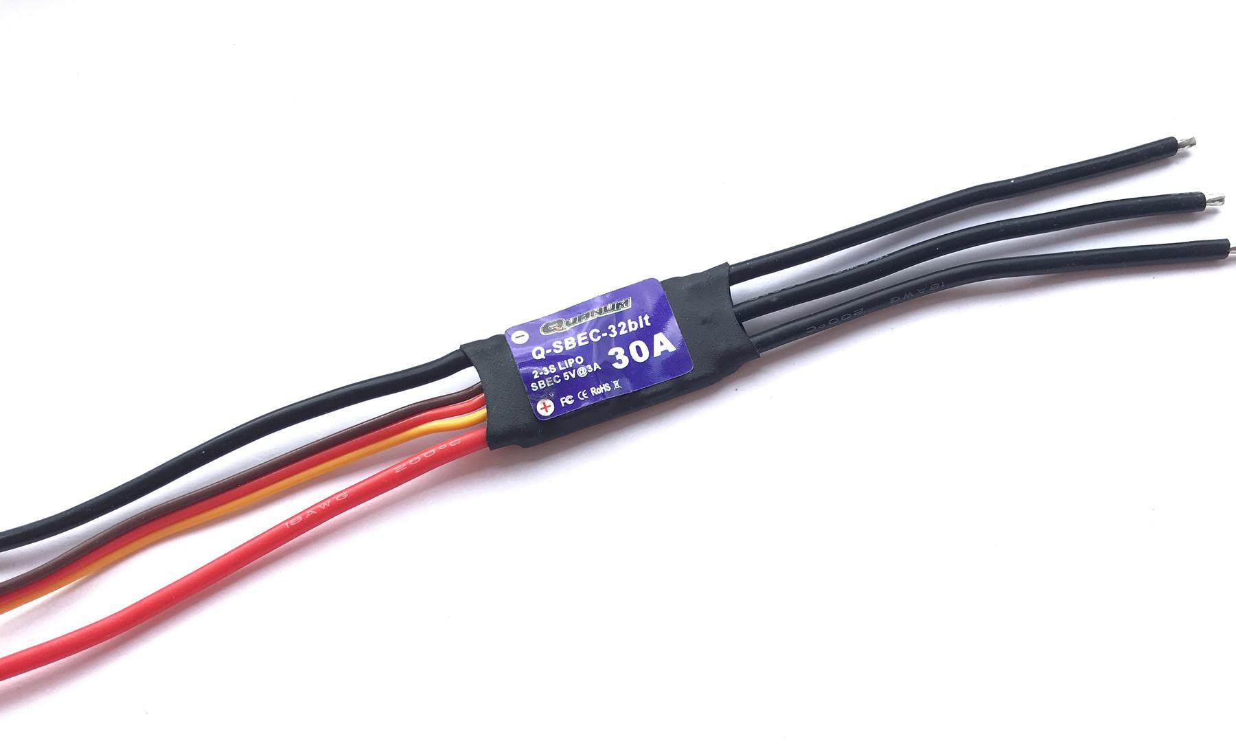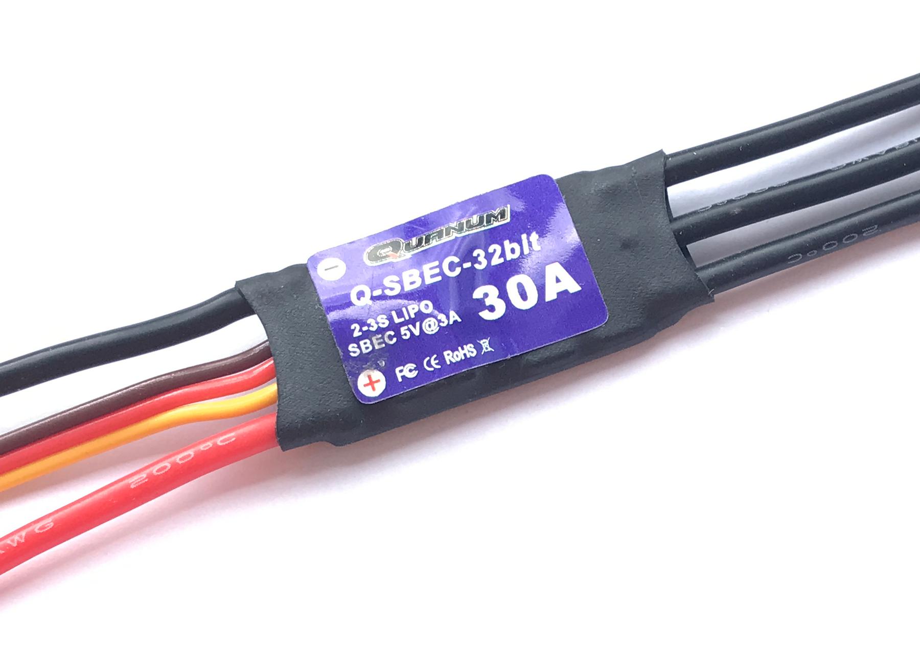 Quanum BLHeli32 30A ESC with SBEC is a modern lightweight "drone" speed control. However unlike most drone ESCs it has an integrated switching battery eliminator circuit (SBEC) for powering the RC.