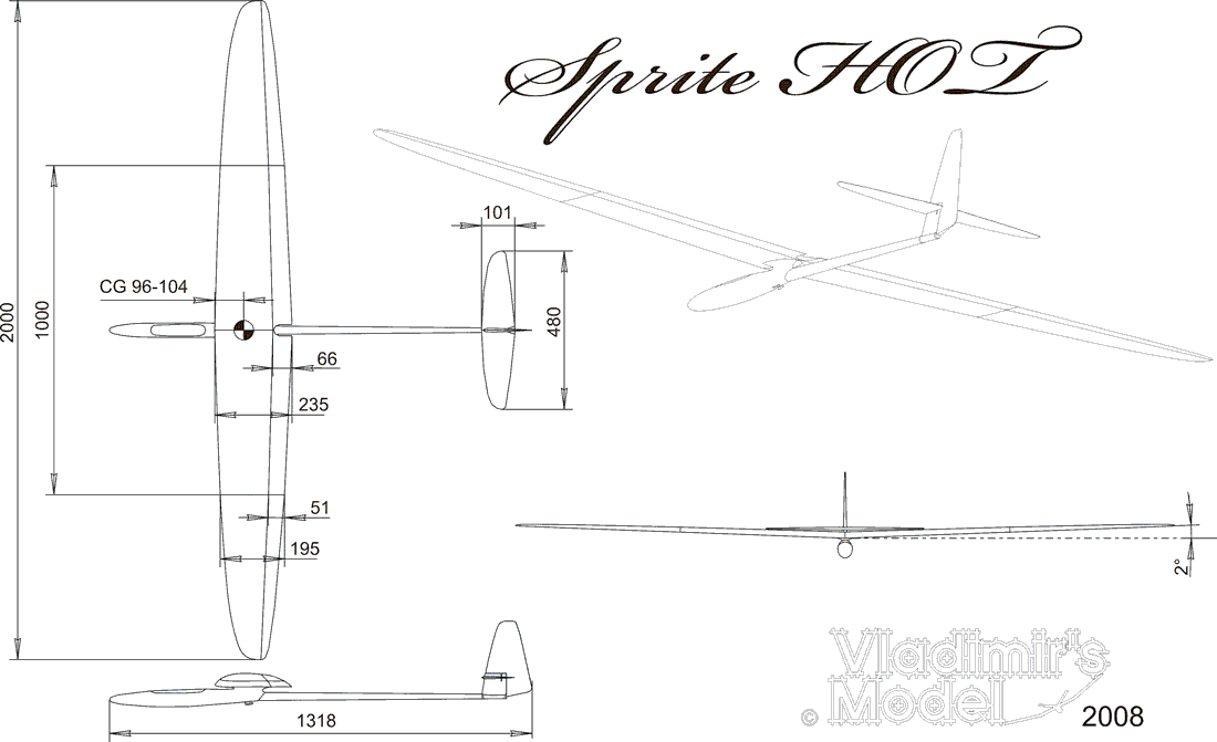 The Vladimir's Models Sprite Hot is a 2m very efficient fully molded glider for thermal and aerobatics on the slope or from a field. The advanced design by Dr Mark Drela makes it a superb 2m soarer while the low drag, low dihedral and large controls make it a great hot dog plane too.