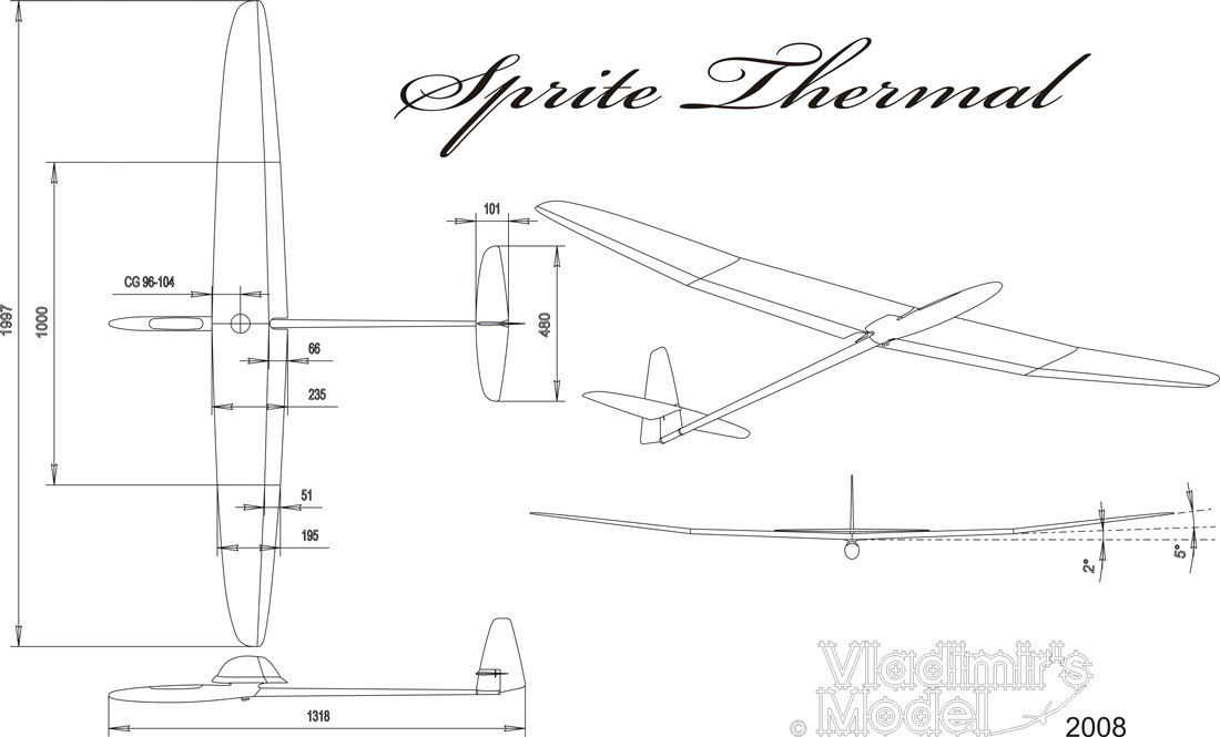 The Vladimir's Models Sprite Thermal is a very efficient fully molded 2m glider intended mainly for competitive and sport thermal soaring. The advanced design by Dr Mark Drela gives excellent performance as a highly competitive 2m thermal soarer. By combining low weight and large ballast compartment the Sprite Thermal is equally at home in calm and windy conditions. Its well-balanced controls, excellent speed range, and outstanding thermal soaring capability make it particularly attractive to expert flyers who are looking for 3m performance in a conveniently compact 2m package.